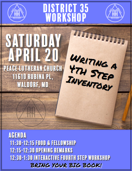 District 35 4th Step Workshop April 20, 2024 @ 11:30 am - 1:30 pm Peace Lutheran Church Rubina Place, Waldorf, MD, United States 4th Step Workshop Flyer 2024