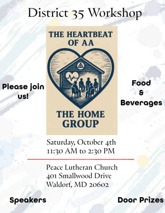 District 35 Workshop – The Heartbeat of AA – The Home Group October 4, 2025 @ 11:30 am - 2:30 pm Peace Lutheran Church Rubina Place, Waldorf, MD, United States District 35 Home Group Workshop Flyer