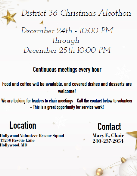 District 36 Christmas Alcothon December 24, 2024 @ 10:00 pm - December 25, 2024 @ 10:00 pm Hollywood Volunteer Rescue Squad Rescue Lane 43256, Hollywood, Maryland, United States District 36 Christmas Alcothon 2024 Contact Mary F. at [...]