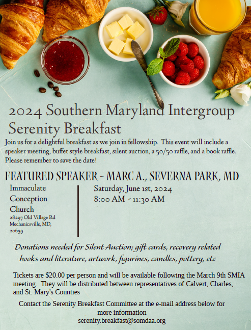2024 SMIA Serenity Breakfast June 1, 2024 @ 8:00 am - 11:30 am Immaculate Conception Church Old Village Road, Mechanicsville, MD, United States Flyer below Serenity Breakfast 2024 $20.00