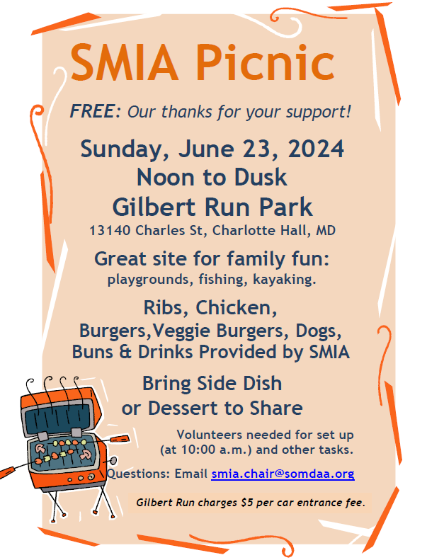 SMIA Picnic June 23, 2024 @ 12:00 pm - 6:30 pm Gilbert Run Park Charles Street, Charlotte Hall, MD, United States Click below to download flyer SMIA Picnic Flyer 6-23-24