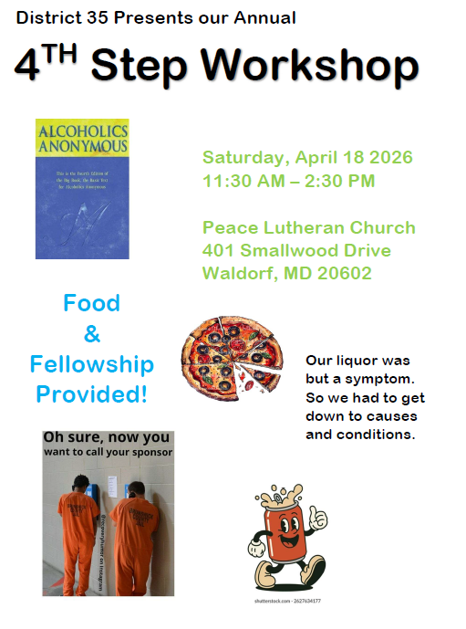 District 35 4th Step Workshop April 18 @ 11:30 am - 2:30 pm Peace Lutheran Church Rubina Place, Waldorf, MD, United States District 35 4th Step Workshop Flyer