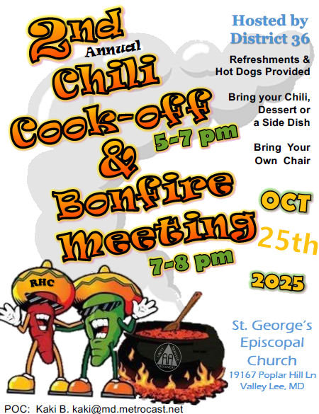 District 36 Chili Cook-Off October 25, 2025 @ 5:00 pm - 8:00 pm St. George's Episcopal Church Poplar Hill Lane, Valley Lee, Maryland, United States District 36 Chili Cook-Off Flyer
